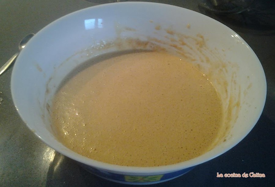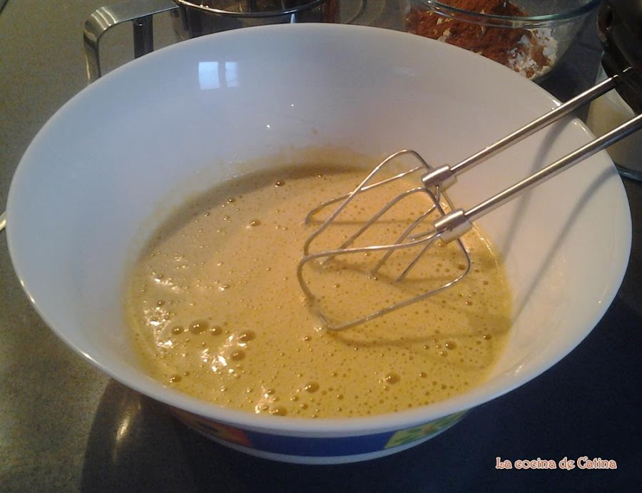 Añadir los huevos y batir con las varillas eléctricas, añadir la leche y seguir batiendo hasta que esté integrada.