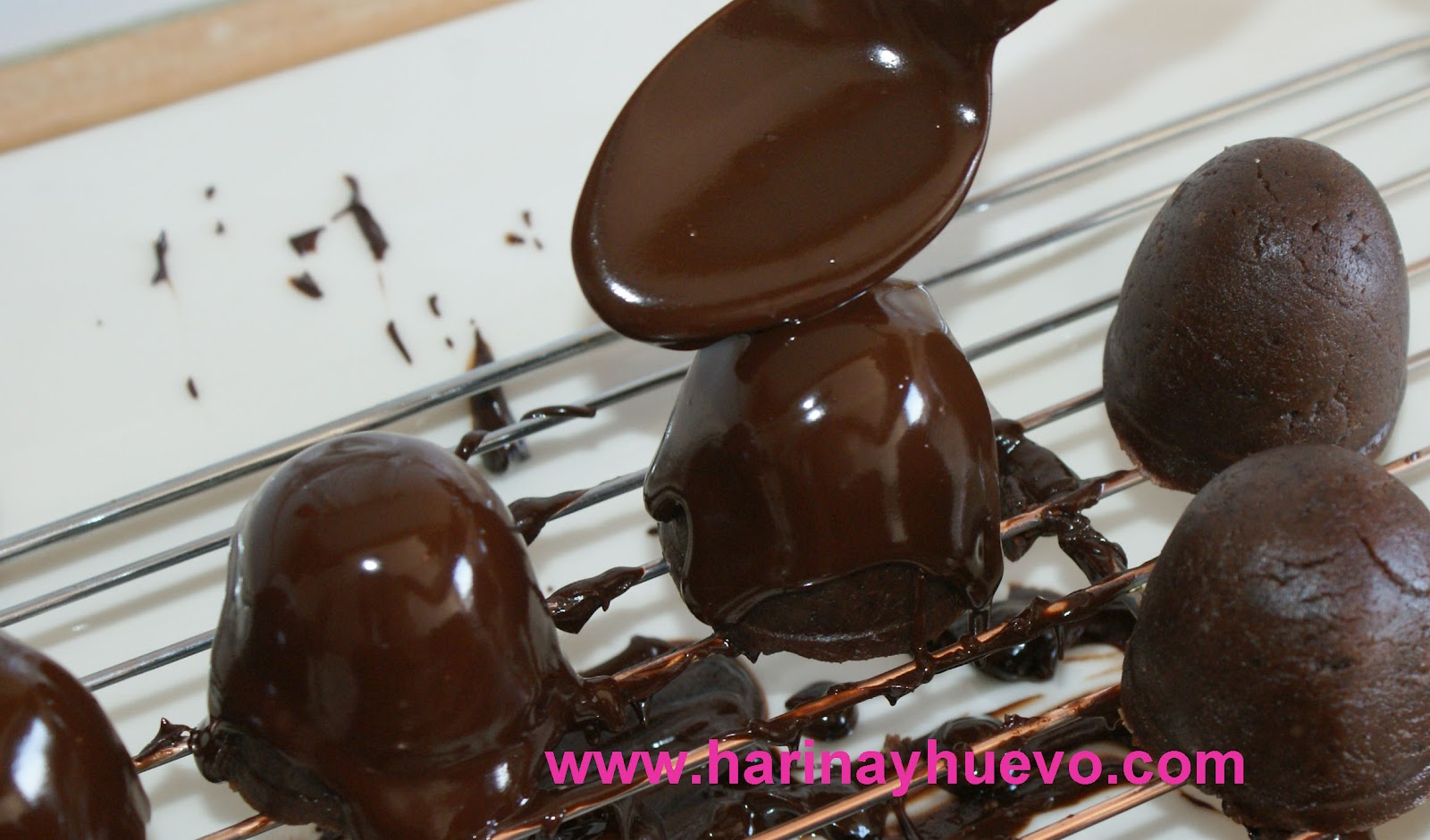 Una vez que los tenemos hecho solo nos queda cubrirlos con chocolate. Para ellos los colocamos en una rejilla con un plato debajo, de esta manera al echar el chocolate recogemos lo que se cae y no manchamos.
