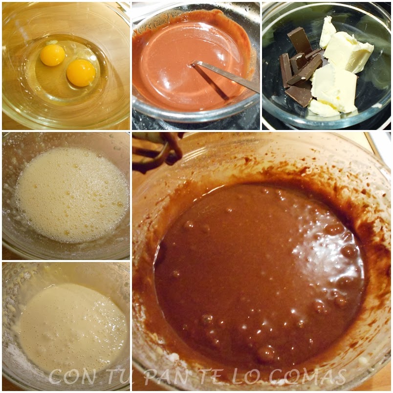 1. Derretir al baño maría el chocolate troceado con la mantequilla. Dejar que se temple.