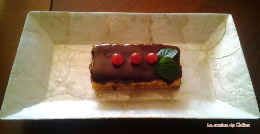 Des-moldar el pastel, cortar en trozos (rectángulos pequeños) y cubrir con la crema de chocolate.