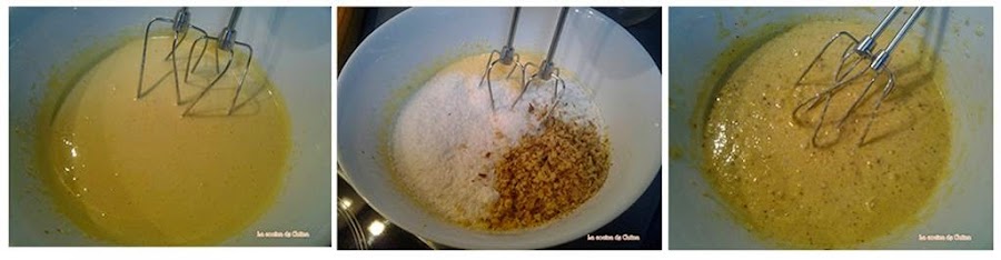 En un cuenco ponemos los huevos, la cucharadita de esencia de vainilla y el azúcar, batimos bien y añadimos la harina tamizada con el royal, la sal, el coco y las nueces. Remover para que se mezcle todo bien y verter sobre la masa cocida.