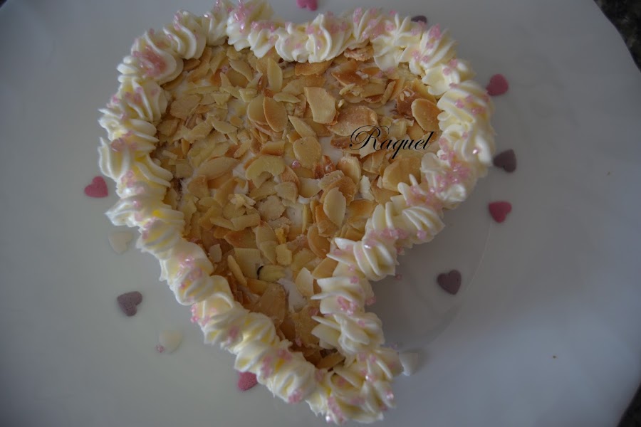Ahora montamos el frosting de cacao por las dos partes del bizcocho y los laterales y dejamos un poco para adornar después, juntamos las dos mitades y cubrir todo el bizcocho y adornar con las almendras y corazones de azúcar.