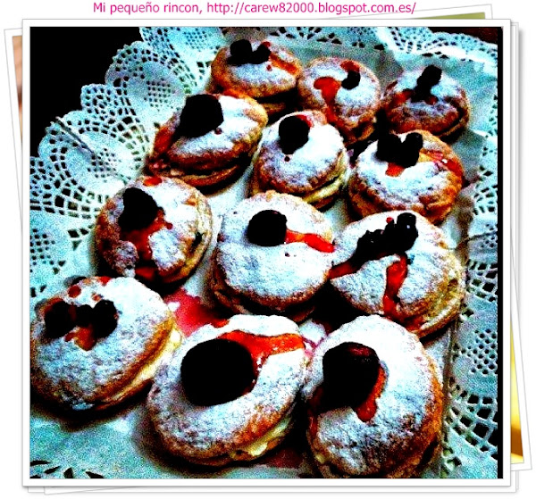 Estiramos las masas y la cortamos con ayuda de una copa o algo con forma redonda ,en realidad la forma da igual , precalentamos el horno a 180 grados y ponemos los hojaldres en una bandeja y los pintamos con huevo y dejamos en el horno hasta que suban y se doren, los sacamos y dejamos enfriar.