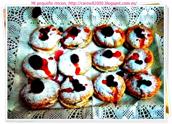 Ponemos azúcar glas en un colador y espolvoreamos por encima todos los pastelitos, a continuación le pondremos una fruta confitada con un poquito del almíbar que llevan.
