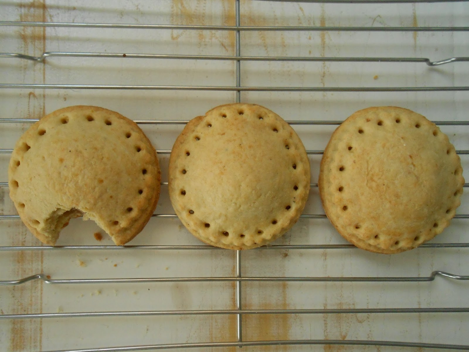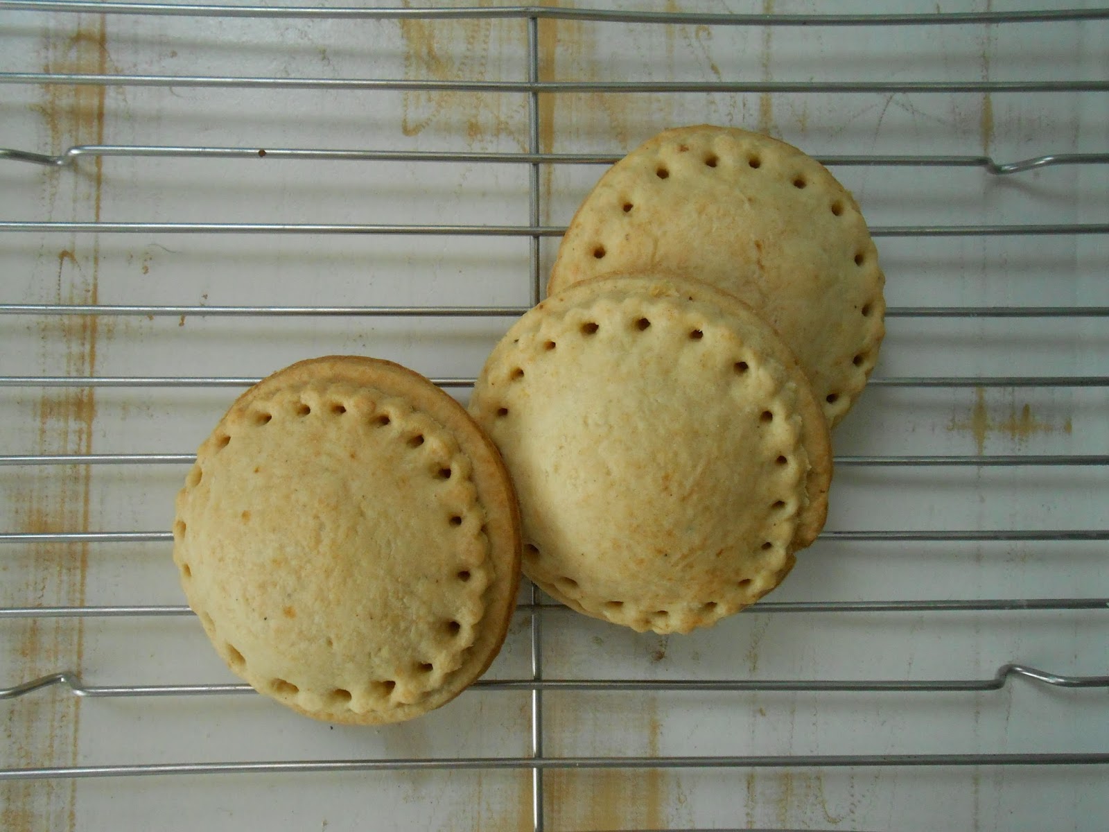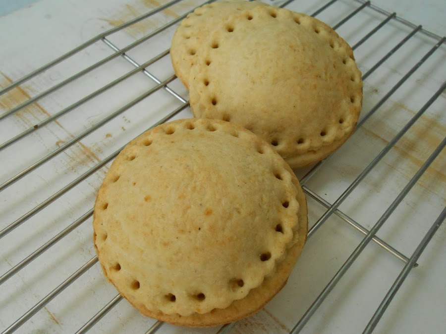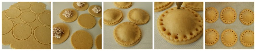 Amasar, estirar con rodillo sobre le encimera (mesada) enharinada y cortar en forma de discos. Colocar relleno en un disco, humedecer los bordes y cubrir con otro disco. Pegar bien los bordes para que no se abra al cocinarse. Si desean pueden hacerle agujeritos en el borde como hice yo, utilizando la punta de una boquilla. Pintar la superficie con leche, colocar en la bandeja para horno y cocinar a 180º durante 15 minutos, aproximadamente. Recuerden que cocino en un horno a gas, con calor sólo de abajo y en la rejilla central.