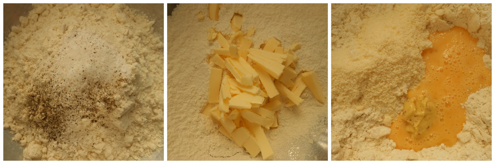 En un bol tamizar la harina con la sal, la pimienta y la levadura. Añadir la mantequilla troceada y desmenuzarla con un tenedor. Agregar el queso rallado, el huevo y el agua. (La receta original pone 4 cucharadas de agua, pero yo fui agregando de a una y con dos cucharadas fue suficiente).