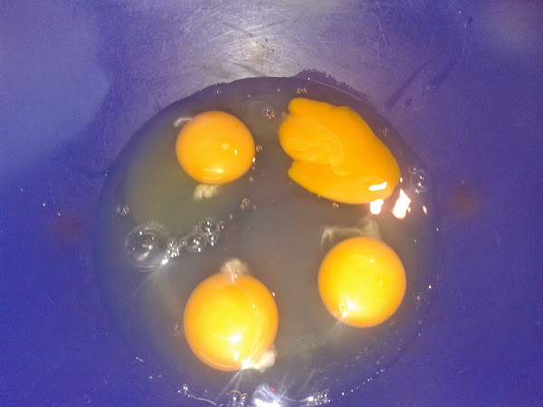 En un cuenco grande cascamos los huevos y los batimos con 170 g de azúcar, con las varillas eléctricas hasta que doblen su volumen.