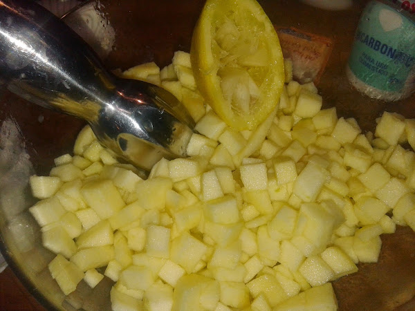 Pelamos y cortamos las manzanas, retirándoles el corazón y la troceamos en cuadraditos pequeños. Les rociamos por encima el zumo de medio limón para evitar que se oxiden.