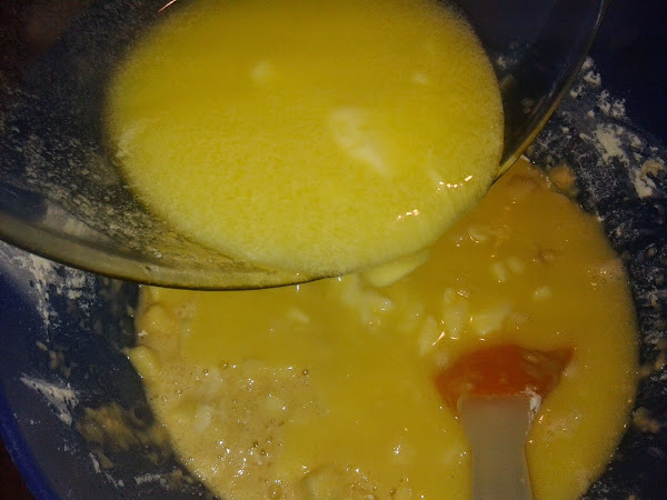 También echaremos la mantequilla fundida. (le he dado un golpe de microondas de 30 segundos) Y mezclamos bien hasta obtener una masa homogénea.