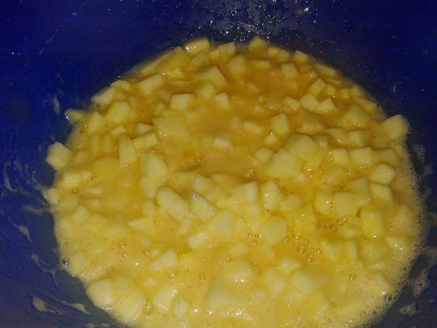 Agregamos las manzanas con limón al huevo batido con el azúcar.
