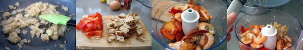 Trocear el pimiento y el pan. Colocar en el procesador de alimentos o en el vaso de la batidora. Añadir el marisco, el huevo y la cebolla pochada. Condimentar con la mostaza, la mayonesa y el pimentón. Triturar hasta conseguir una pasta homogénea. Colocar en un plato y reservar.