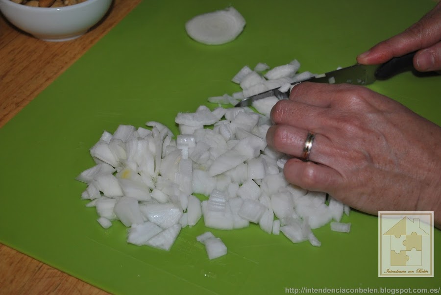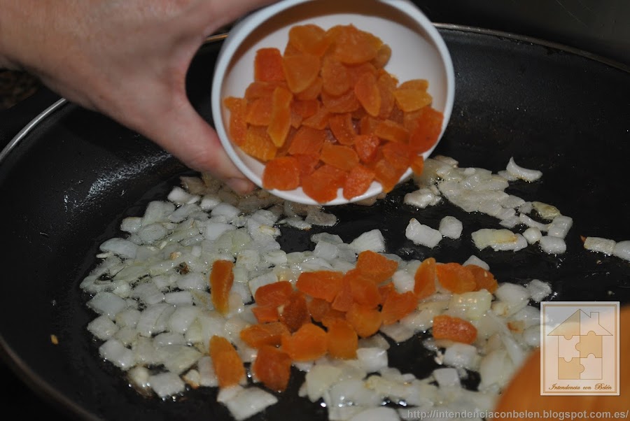 Cuando está transparente y tierna, añadimos los orejones, las pasas y los anacardos.