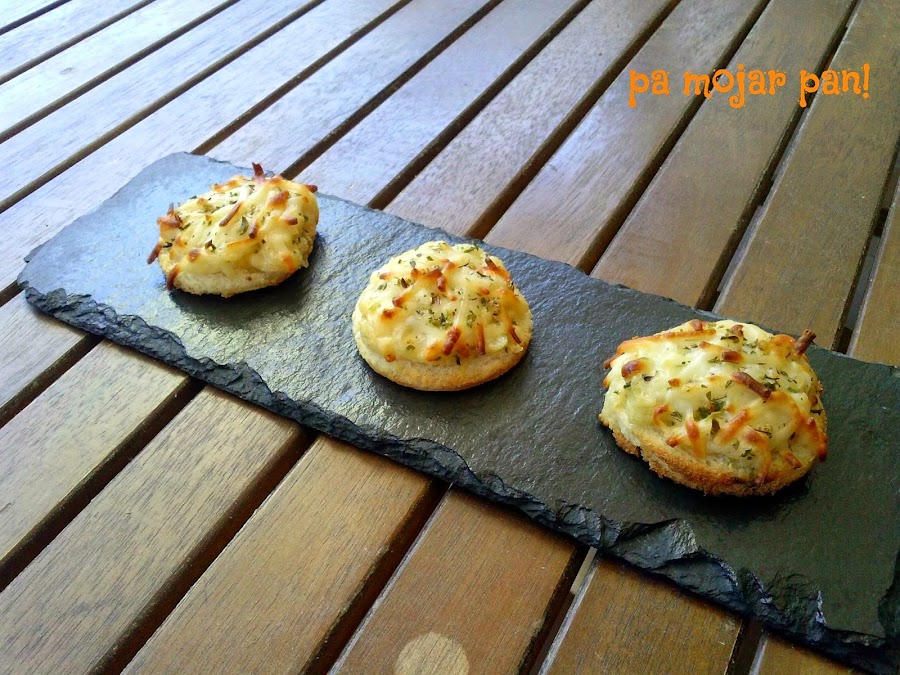 El montaje es bien sencillo: ponemos una cucharada de la salsa de cebolla sobre uno de los círculos. Agregamos una buena cantidad de queso rallado y tapamos con otro círculo de pan. Lo hacemos así, tan alto como queramos.