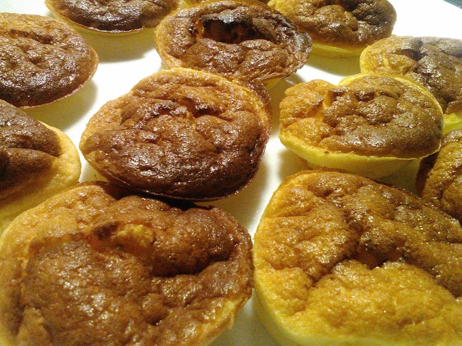 Llenamos tres cuartas partes de los moldes y horneamos en horno precalentado a 170º durante 12 minutos, bajamos la temperatura a 150º y dejamos 10 minutos más. Dejamos reposar en el horno apagado durante 10 minutos