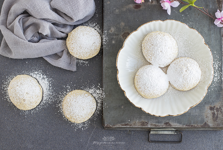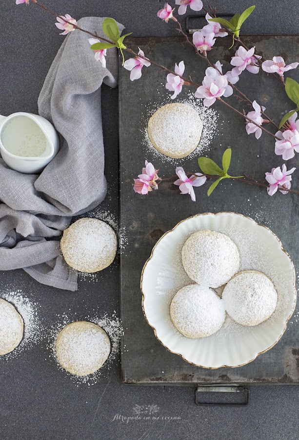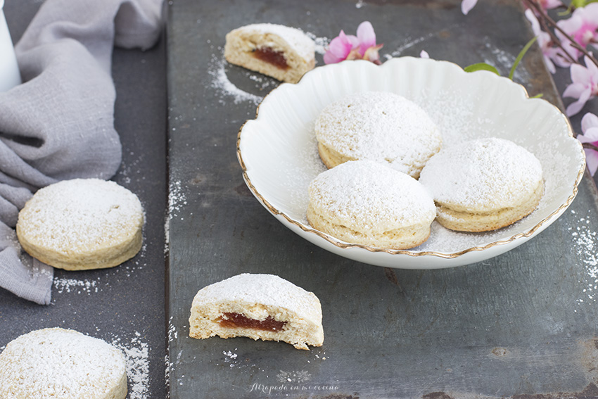 Llevamos al horno precalentado (yo los he horneado en dos tandas) a 180º durante unos 20 minutos. Una vez horneados sacamos y dejamos templar sobre una rejilla. Espolvoreamos con azúcar glass. Podéis tomarlos templados o fríos, igualmente están ricos.