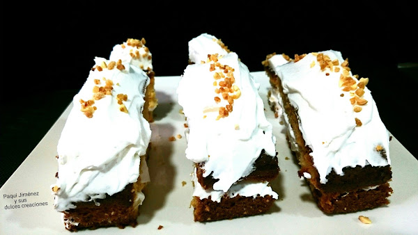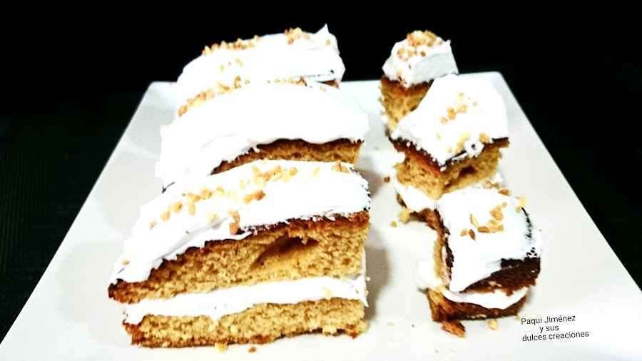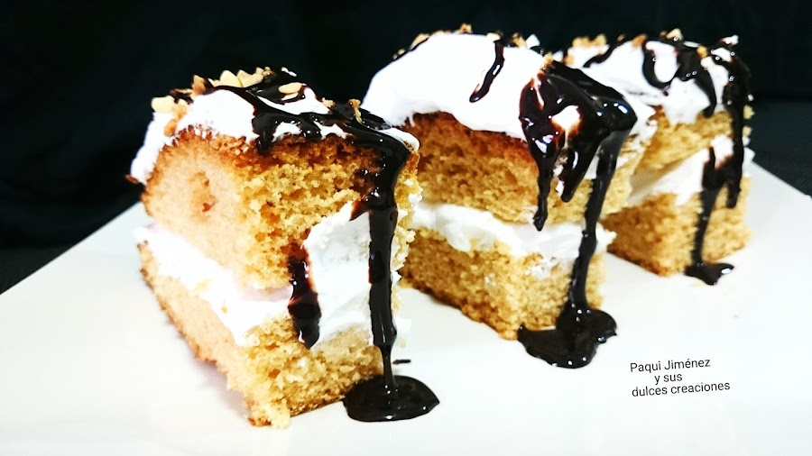 Con un cuchillo afilado partir por la mitad, hacer porciones rellenar con la Glasa y cubrir por encima, poner un poquito de sirope de chocolate y terminar con unas almendras picadas.