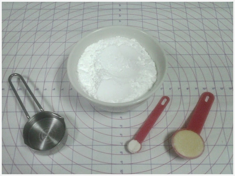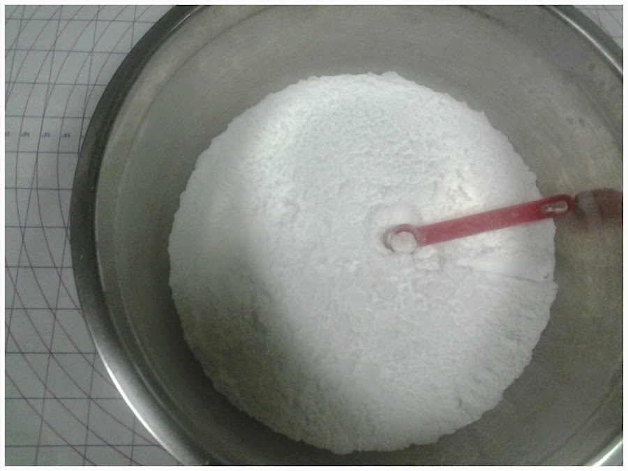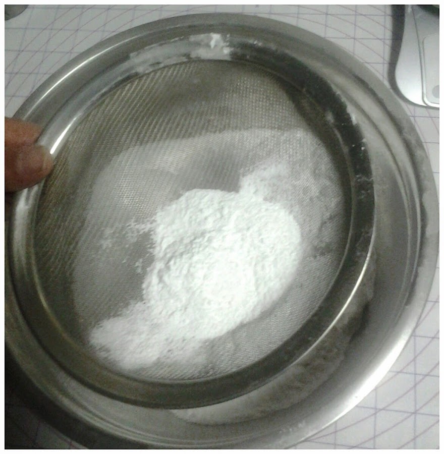 Ahora tamizaremos el azúcar impalpable con la goma tragacanto para lograr que se mezclen bien .