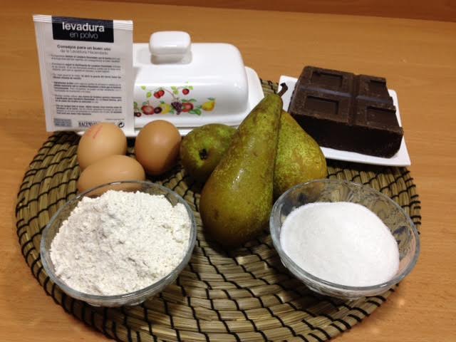 4 ous 125 grms de sucre 100 grms de farina 1/2 sobre de llevat químic 250 grms de xocolata negre 4 peres 70 grms de mantega