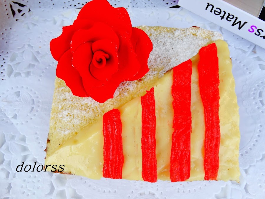 Para celebrar Sant Jordi, os dejo este rico pastel de bizcocho relleno de nata (crema de leche), con chocolate en su contorno y cubierto con crema . ¡¡Feliz día!!