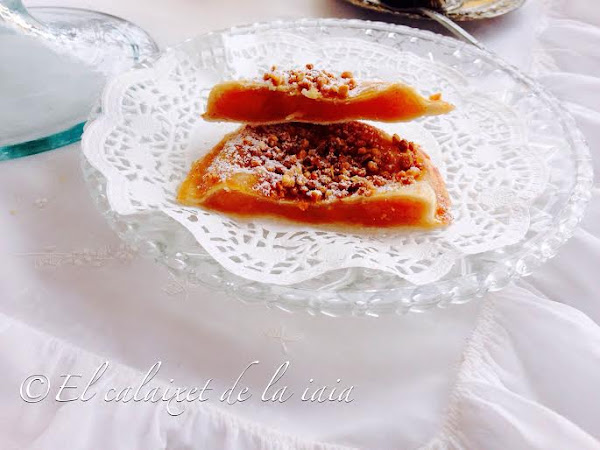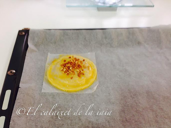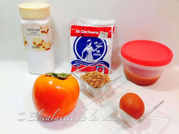 Almendra picadaLo normal es hacer dos pastelitos por comensal y necesitaremos una rodaja de caqui y dos obleas por cada pastelito
