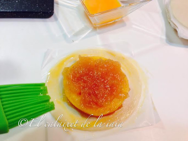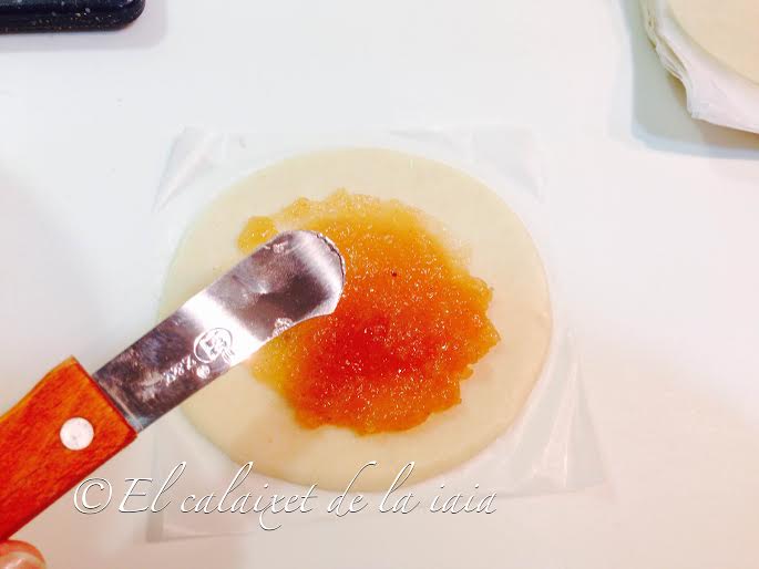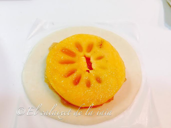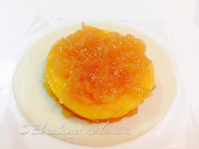 Comenzaremos pelando el caqui, cortando en rodajas con mucho cuidado. Cuando el caqui está en su punto, es tan tierno que cuesta manejarlo. Necesitaremos un corta pastas para realizar unas rodajas de tamaño que quepan en las obleas, pero que no cunda el pánico!