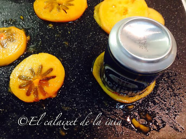 Los caquis, son una fruta habitual en mi tierra por éstas fechas, originarios de Japón y China. Aunque hay dos clases de caquis, el Persimón que está verde tiene un color amarillo y cambia a color anaranjado y similar a un melocotón maduro cuando está en su punto adecuado y es muy difícil de cortar fino y manejar, porque se rompe por su jugosidad,y cuando está verde tiene un color amarillo, y el caqui Classic que es de color rojo y suele comerse con cuchara ya que su pulpa es gelatinosa, como mermelada.