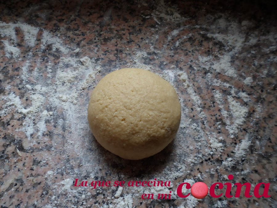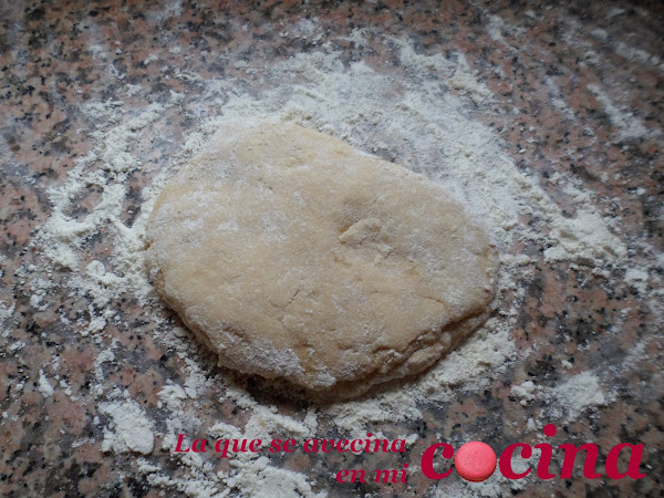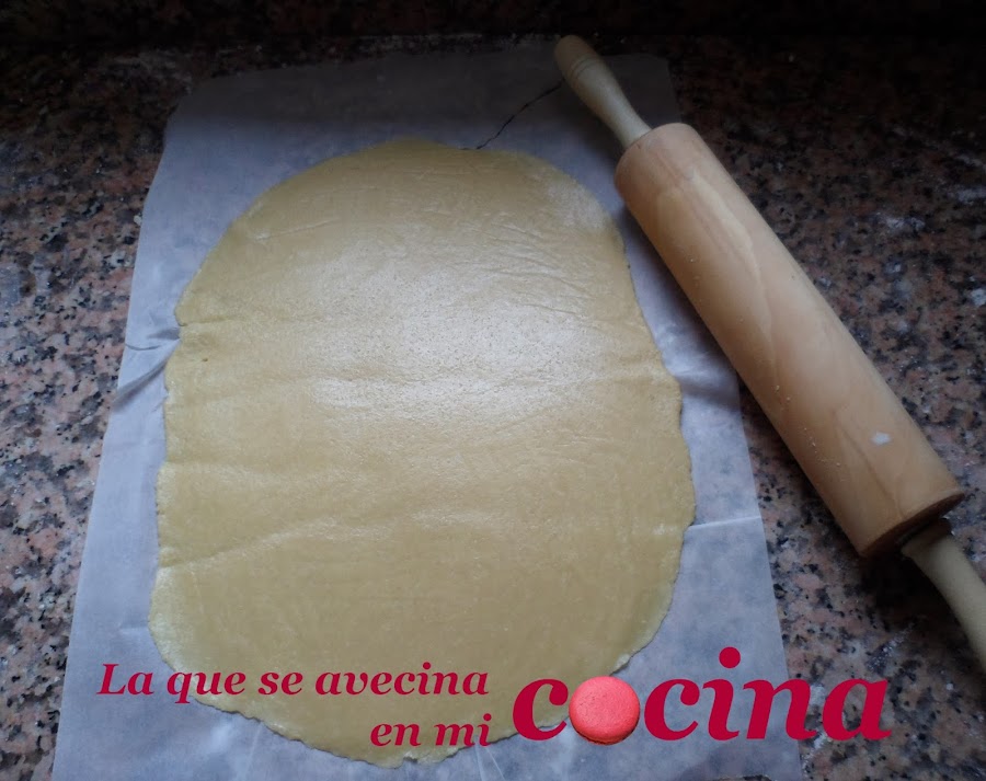 Ya con un rodillo, nos disponemos a alisar la masa hasta conseguir un grosor de 0,5 cm. aproximadamente. Aunque nos parezca muy poco, no os preocupéis ya que cuando la horneemos aumentará su espesor.