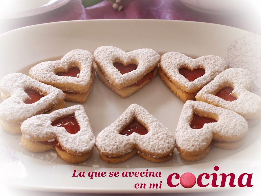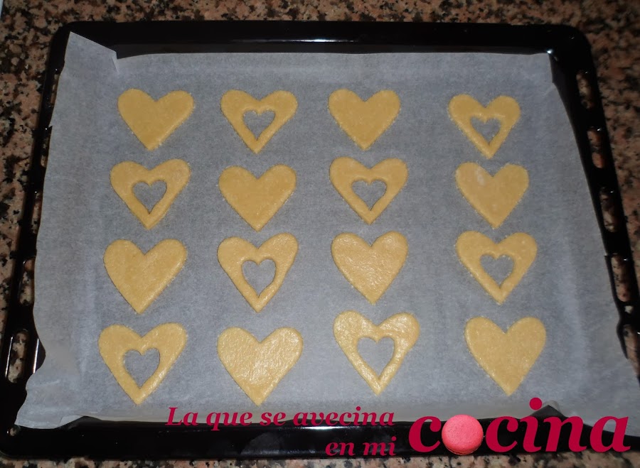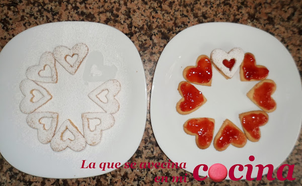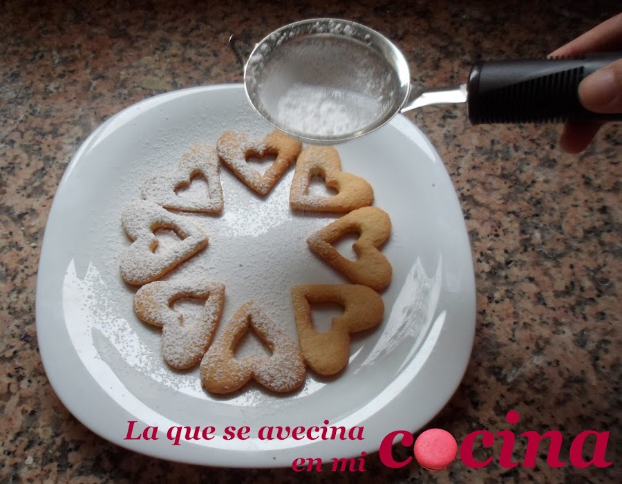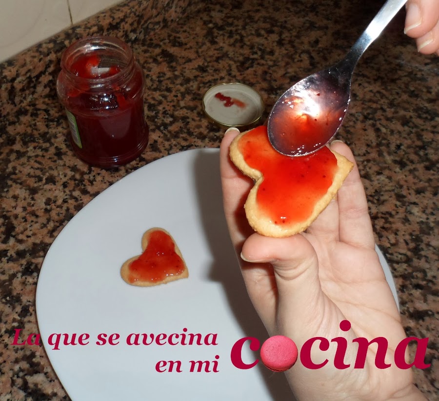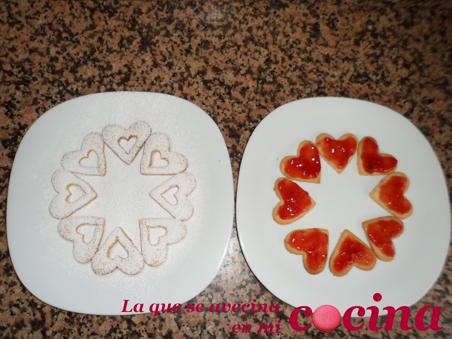 Cuando estén frías nos pondremos con la decoración. Empezaremos tamizando azúcar glas en las partes de arriba de las pastas (doble corazón). Y luego le pondremos la mermelada de fresa a las partes de abajo para que hagan de unión entre ambas partes.