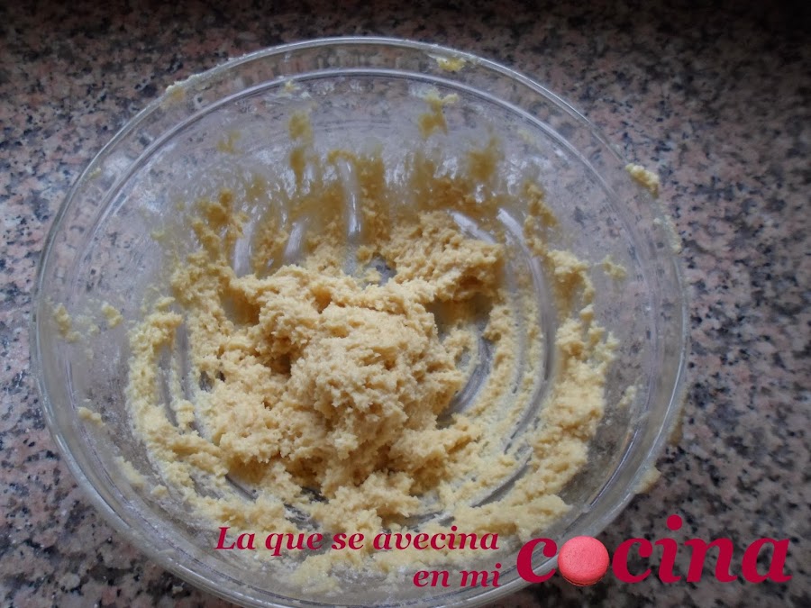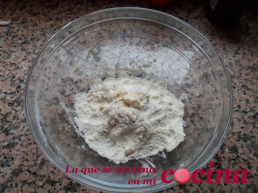 A continuación añadimos la mantequilla blandita, la troceamos con los dedos y la integramos con los ingredientes anteriores.