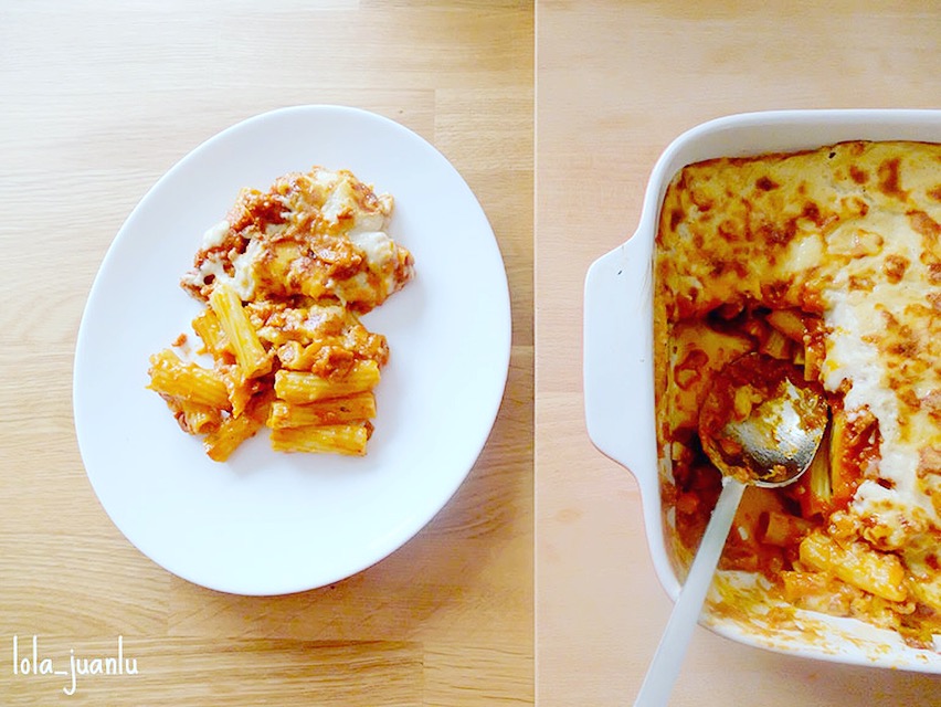 Es el momento de montar el pastitsio y sus diferentes capas. Para ello, seleccionamos una fuente de horno rectangular que engrasamos con aceite de oliva y colocamos en ella la pasta que hemos cocido previamente. A continuación le añadimos la salsa boloñesa y sobre ella la salsa bechamel. Terminamos espolvoreando un poco de queso.