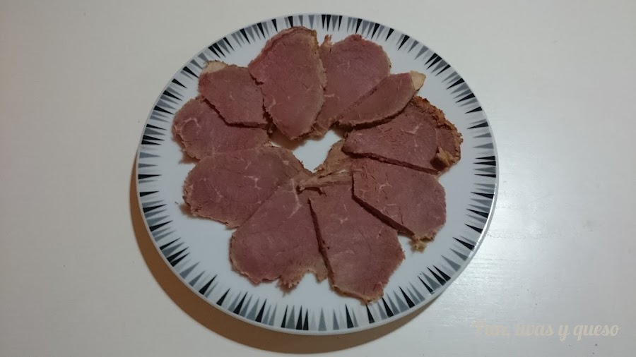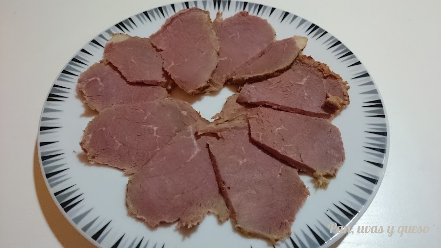 El tiempo de cocción depende del tipo de Crock-Pot y del tamaño de la pieza de carne. Como mi olla es rápida controlé la temperatura con el termómetro-sonda y la apagué cuando el centro de la carne alcanzó los 68ºC.
