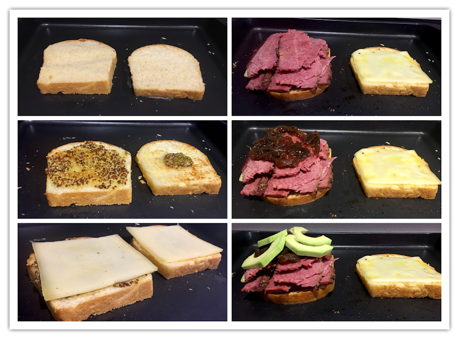 2. Una vez tenemos el Pastrami listo, que es nuestro ingredientes estrella ya podemos preparar el sandwich. En una plancha caliente ponemos las dos rebanadas de pan con mantequilla. Cuando tomen algo de color les damos la vuelta. Ponemos una cucharadita de mostaza antigua sobre cada rebanada, y sobre ésta el queso gruyere. Cuando el queso empiece a deshacerse ponemos los 100g de Pastrami sobre una de las rebanadas de pan y encima la cebolla confitada. Finalmente las rodajas de aguacate, cubrimos con la otra rebanada de pan.
