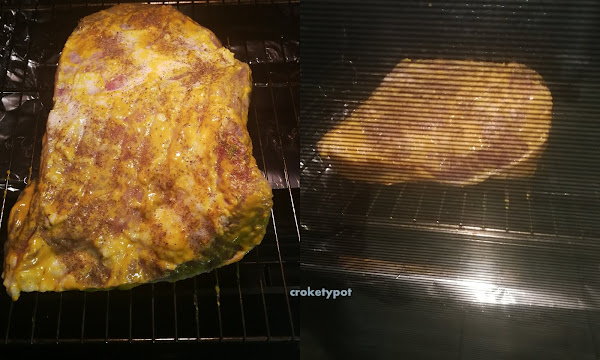 A la carne le extendemos mostaza y pimienta negra cubriéndola bien, si podemos ahumarla lo haremos en este punto, si no pues la hacemos en el horno.