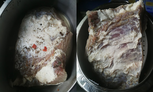 Lavamos bien la carne procurando tener las manos bien limpias, introducimos la carne en la salmuera. Le pondremos algo de peso a la carne (plato, tapadera o similar) para evitar que flote. Tapamos el recipiente con su tapadera o con papel film bien cerrado y lo guardamos en el frigorífico 6 días, y volteamos la carne todos los días sin tocarla con las manos.