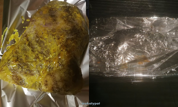 Forramos la bandeja de horno con papel de aluminio y ponemos la rejilla del horno encima a media altura. Ponemos la carne encima y la cocinamos una hora.