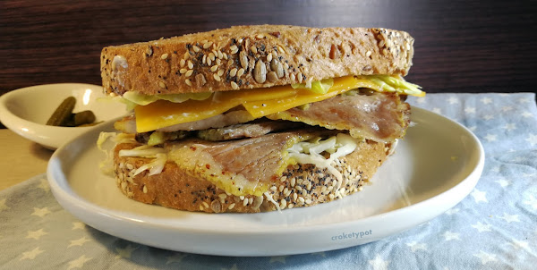 Para 1 sandwich: preparamos 2 rebanadas gordas de pan de cereales con semillas, 3 lonchas de pastrami, 1 rebanada de queso cheddar, mayonesa, mostaza de Dijon, pepinillos en vinagre, lechuga o berros, col chucrut o bien col picada fina que aliñaremos una hora antes con vinagre y sal.