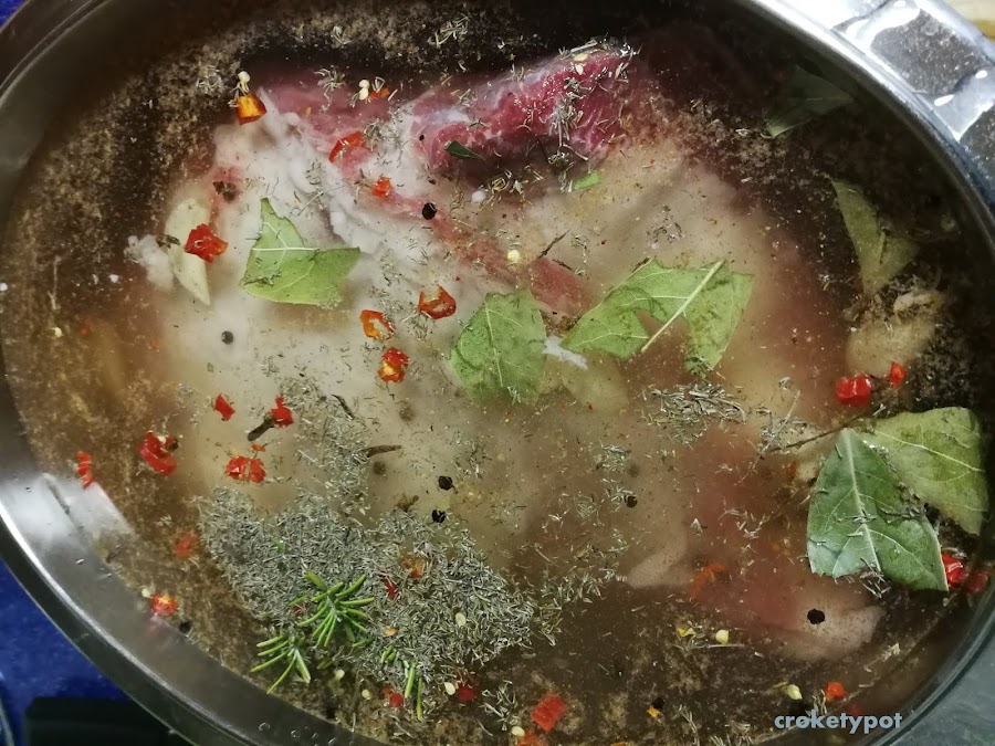 3 litros de agua, 200gr de sal, 0,4 gr. de sal de cura o sal nitro, 100gr de azúcar, 8 ajos aplastados, romero fresco, 1 cucharada de tomillo seco, 1 cucharada de jengibre en polvo, 1 cucharada de pimienta blanca y una de negra en grano, 2 hojas de laurel troceadas, 4 clavos de olor, una guindilla y un palo de canela.
