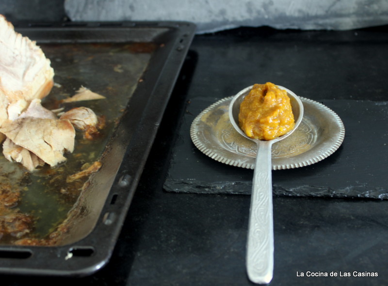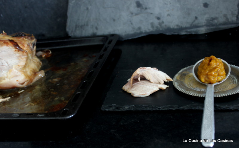 Para hacer la salsa, desgrasa la fuente en el fuego, añade un poco de agua y frota con cuchara de madera. Lonchea el jamón en láminas finas. He acompañado con el Chutney de mi amiga Violeta y con una ensaladilla de patata, huevo cocido, zanahoria cocida y pepinillos en vinagre, cortados en brunoise y aderezada con una salsa de mayonesa y mostaza. Te garantizo exitazo, espero que te guste bsss.