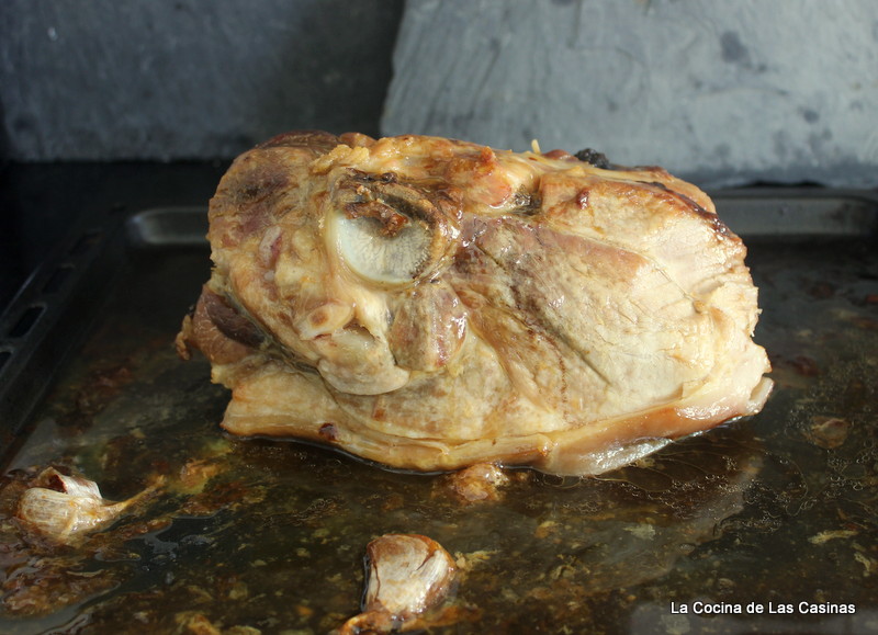 250 ml de AguaUnta con aceite el jamón, incorpora un poco de sal. Coloca en la fuente de horno, añade los dientes de ajo sin pelar y aplastados con el cuchillo junto con el agua. Introduce en el horno precalentado a 180-200º durante una hora y media o hasta que alcance una temperatura de 75º.