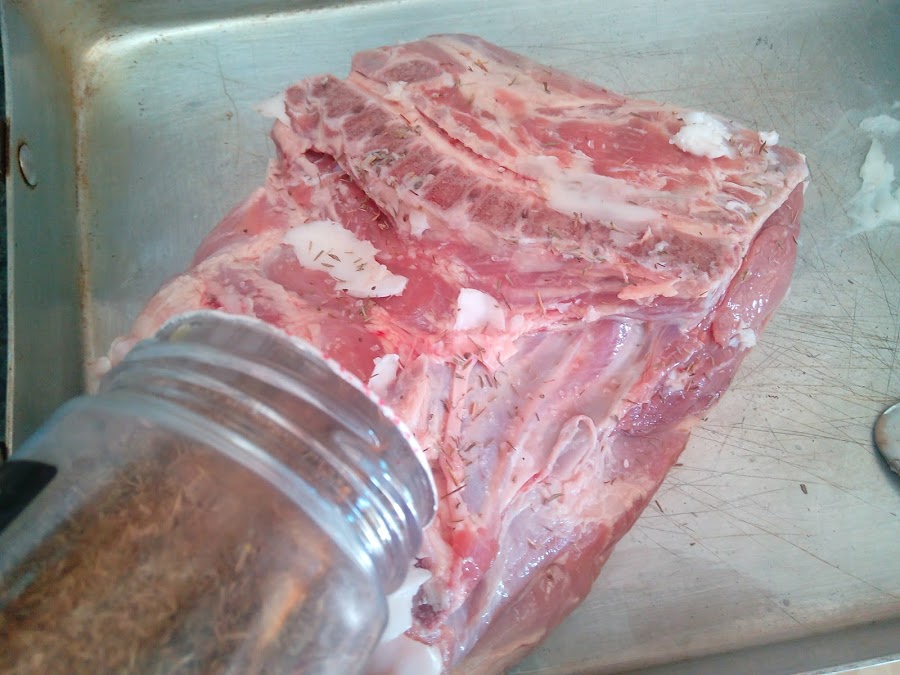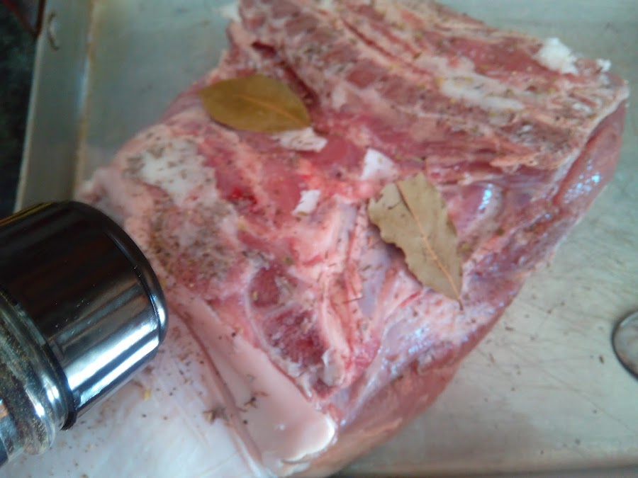 2.- Espolvoreamos con sal, oregano, tomillo y le pegamos unas hojas de laurel.