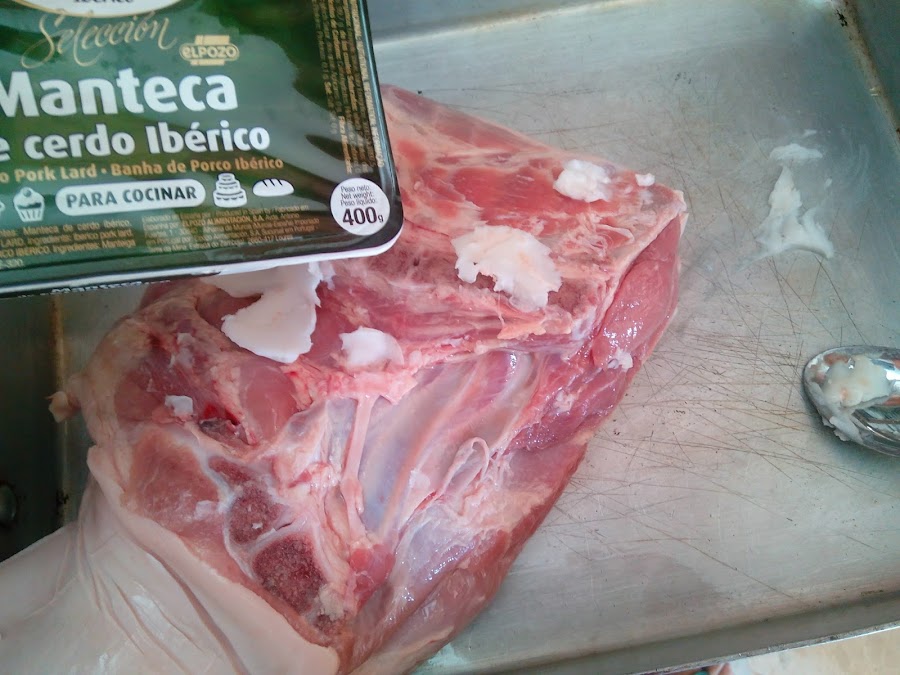 1.- Impregnamos la pata por la cara del hueso con la manteca de cerdo.