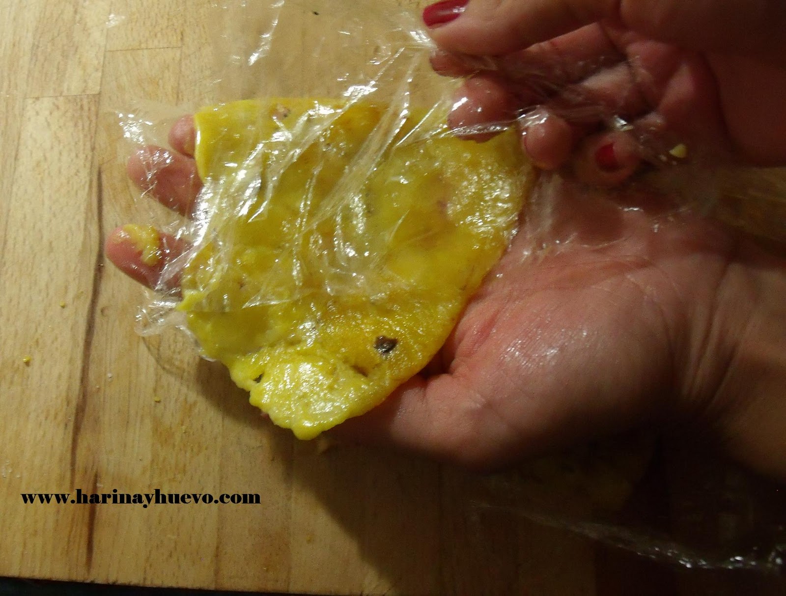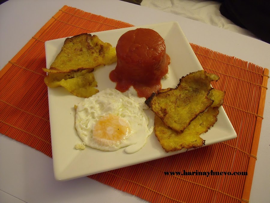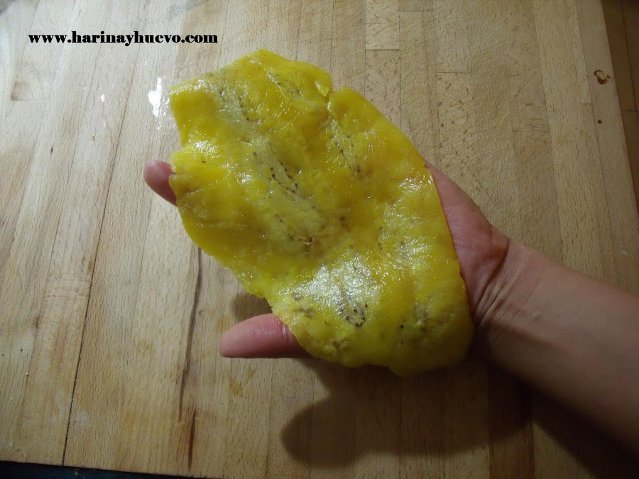 Como ya os he comentado los plátanos deben estar verdes. Se pelan y se cortan en dos trozos. Estos trozos se ponen en una sartén con un poco de aceite a fuego muy lento. Se dejan hasta que se hagan bien por dentro, de manera que se pondrán blandos. Los retiramos del fuego, ponemos uno encima de un film transparente de cocina, encima le ponemos otro. Presionamos con la mano y lo aplastamos.