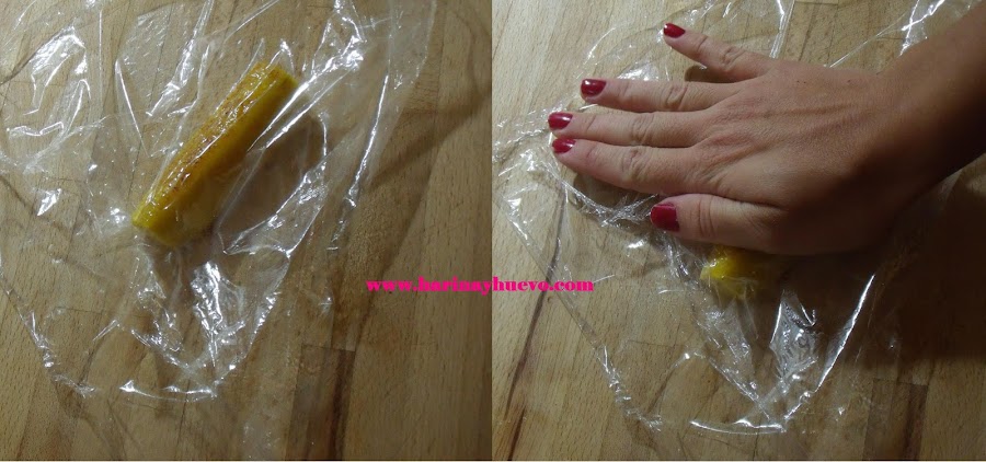 Retiramos el film y sazonamos con un poco de sal. Volvemos a poner el film y seguimos aplastandolo hasta conseguir un capa fina. Retiramos el film.