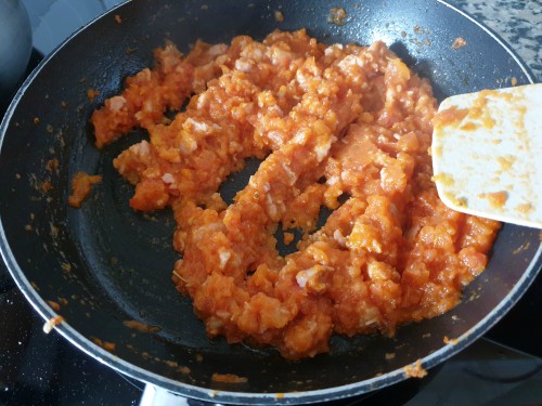 Lo justo para que se puedan pelar bien. Pelar los tomates y triturar con el robot. Añadir a la carne y rectificar de sal. Añadir el azúcar para evitar la acidez. Cocinar a fuego suave durante 30 minutos para que la salsa se concentre. Reservar.