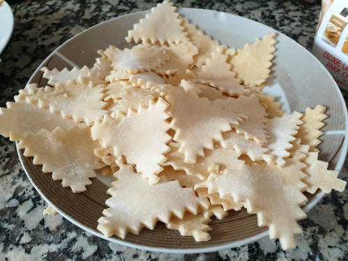 Y vamos con la receta: he hecho pasta fresca en más de una ocasión. Es una preparación que me relaja. Me ocupa mucho tiempo, pero me relaja. Lo curioso de esta receta es que tiene una mezcla de harinas: harina de trigo y harina de maíz, y creo que es un gran acierto.