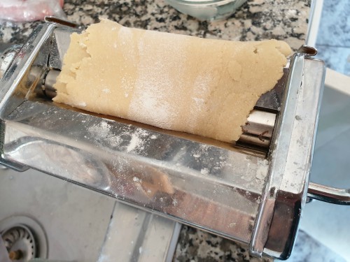 Cortar la masa en porciones y estirar cada porción en la máquina de pasta,