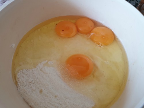 y empezar removiendo los huevos con un tenedor a la vez que vamos integrando la harina. Cuando empiece a integrarse seguir amasando con las manos en la superficie de trabajo espolvoreada de sémola. Formar una bola y envolver en papel film. Dejar reposar 30 minutos.