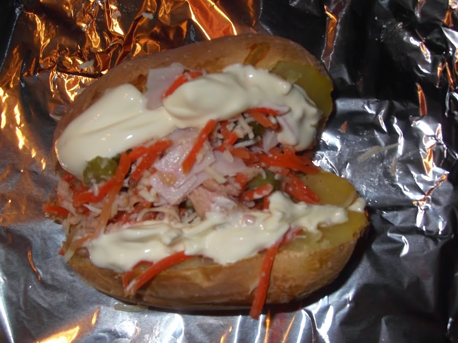 Ahora llega el momento de preparar nuestra patata, cortáis la patata por la mitad, estilo libro sin llegar al final ya que si no se nos saldría el relleno, con un tenedor pequeños le dais algunos cortes a la patata para que así sea más fácil introducir el relleno y que se mezcle con la patata. Incluso podéis sacar parte de la patata, no obstante, esto no lo hacen los feriantes así que yo no lo hice. Ahora le echáis sal y pimienta y le añadís el relleno. Una vez que tenéis mezcla suficiente echáis las salsas que más os gusten y ya está lista para degustar.