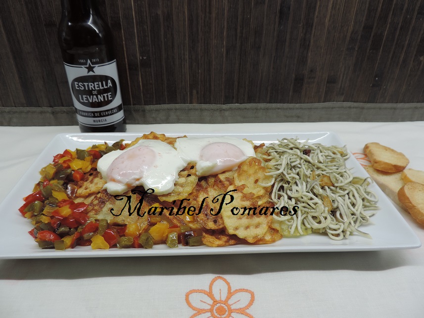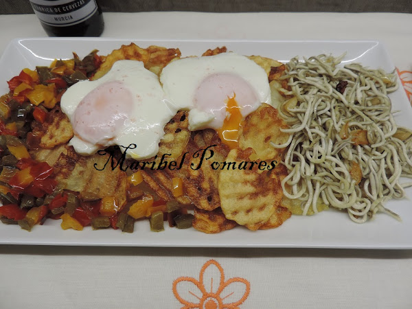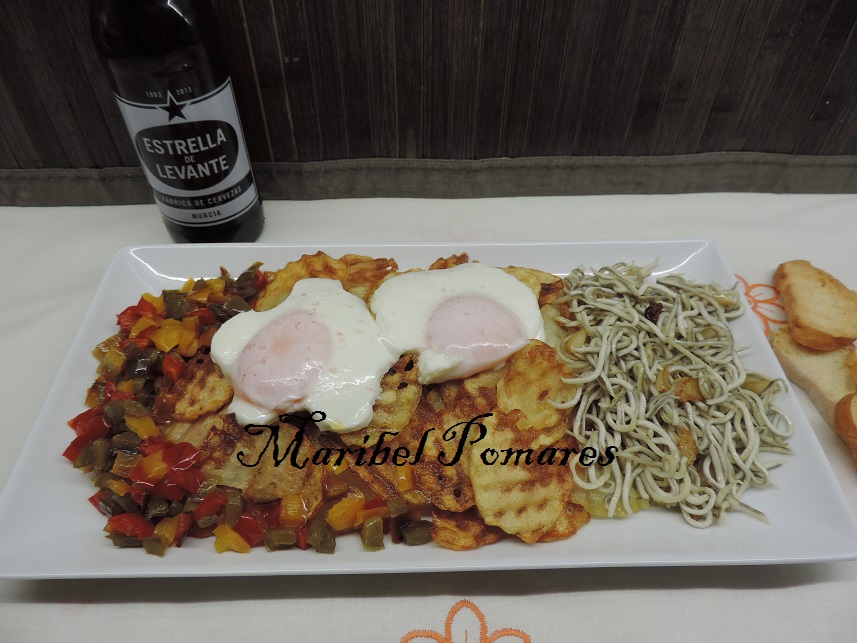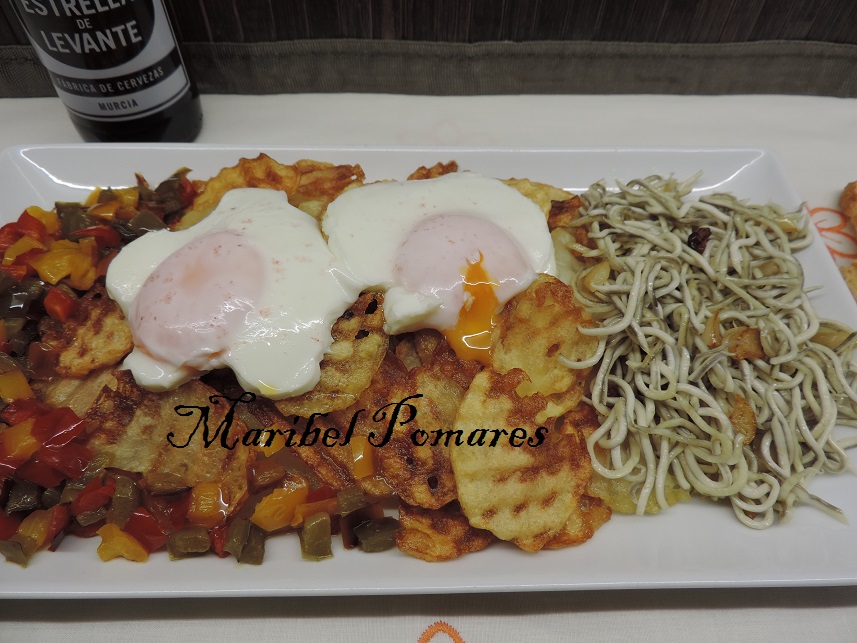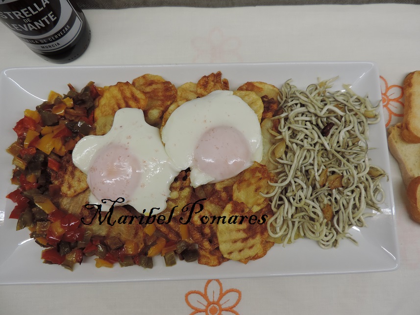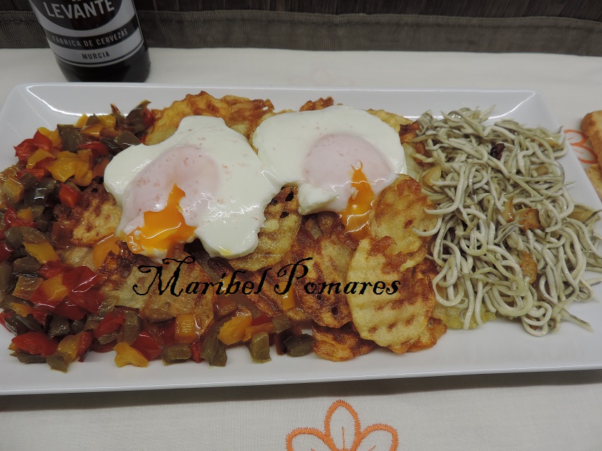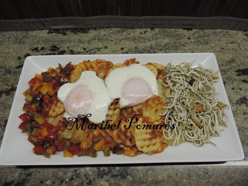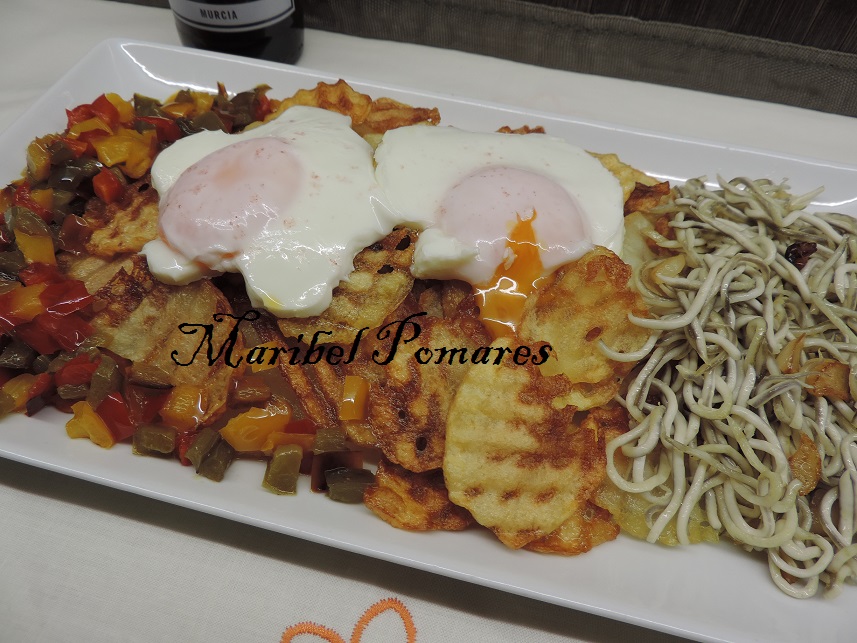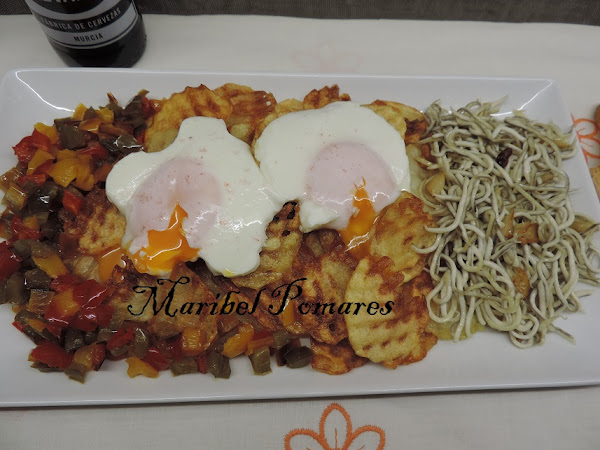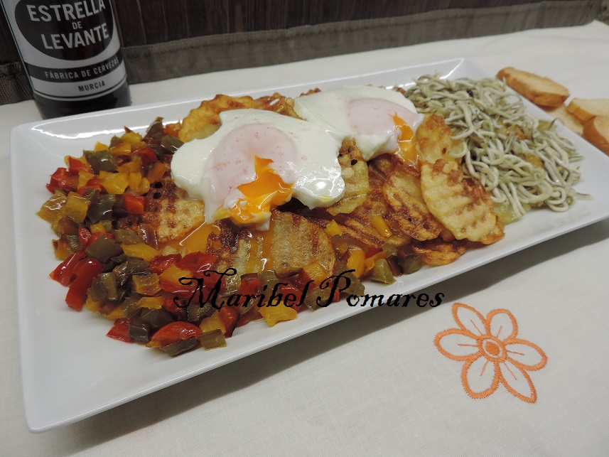 Los pimientos al otro lado y los huevos encima de las patatas.