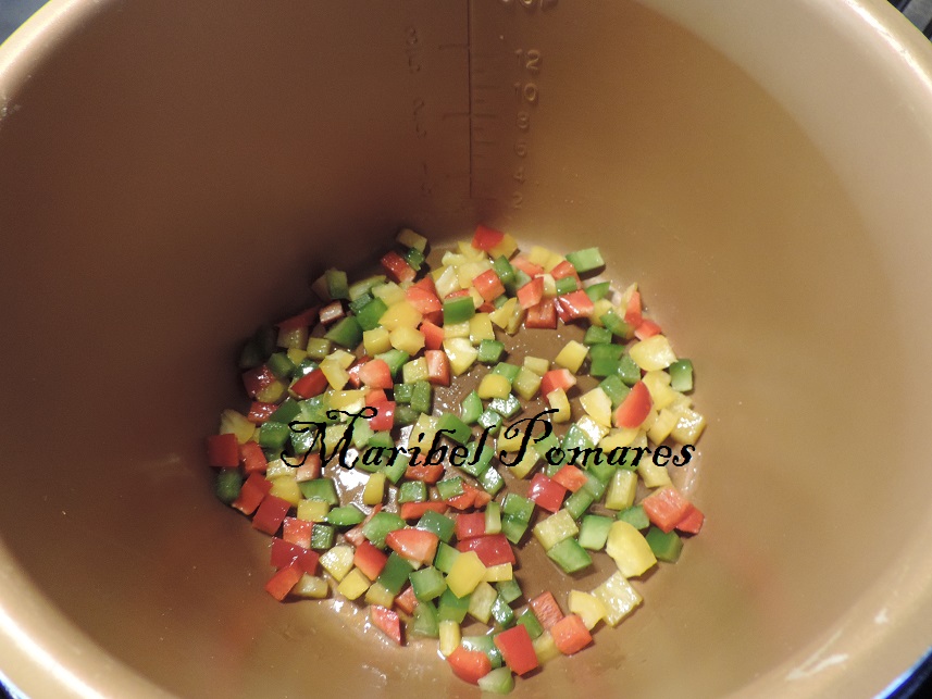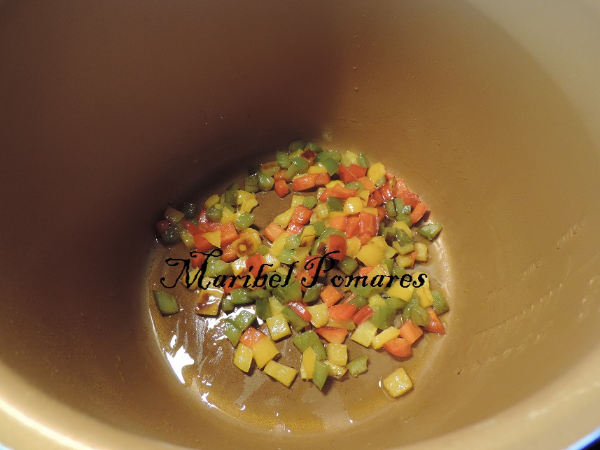 Mientras se hacían las patatas, hemos ido haciendo los pimientos cortados en trozos pequeños, con 2 cucharadas de aceite de oliva y sal.